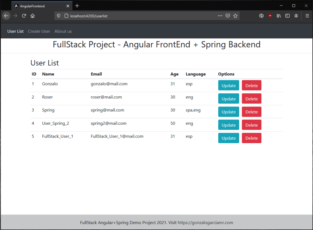 Finalmente actualizaríamos el código HTML de la tabla user-list.component.html, añadiendo botones para las acciones Update y Delete para terminar el ciclo de operaciones CRUD. Para concluir, añadimos una página de información –About Us– y un formulario de búsqueda filtrada por ID, obteniendo el resultado definitivo: